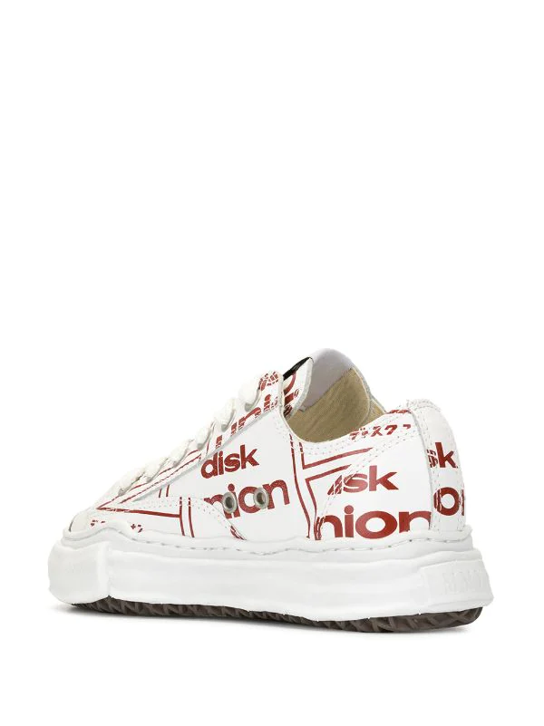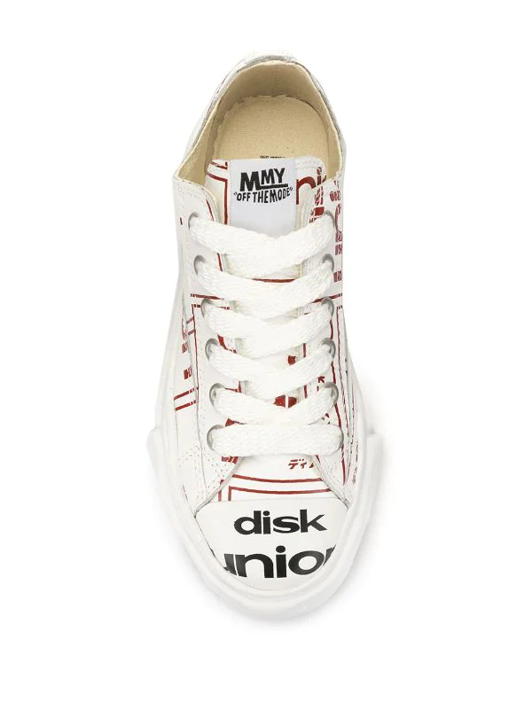 Graphic and text printed platform trainers from Maison MIHARA YASUHIRO featuring a round toe, a lace-up front fastening, a brand embossed tongue, a platform rubber sole, text and linear print and text printed toe cap.