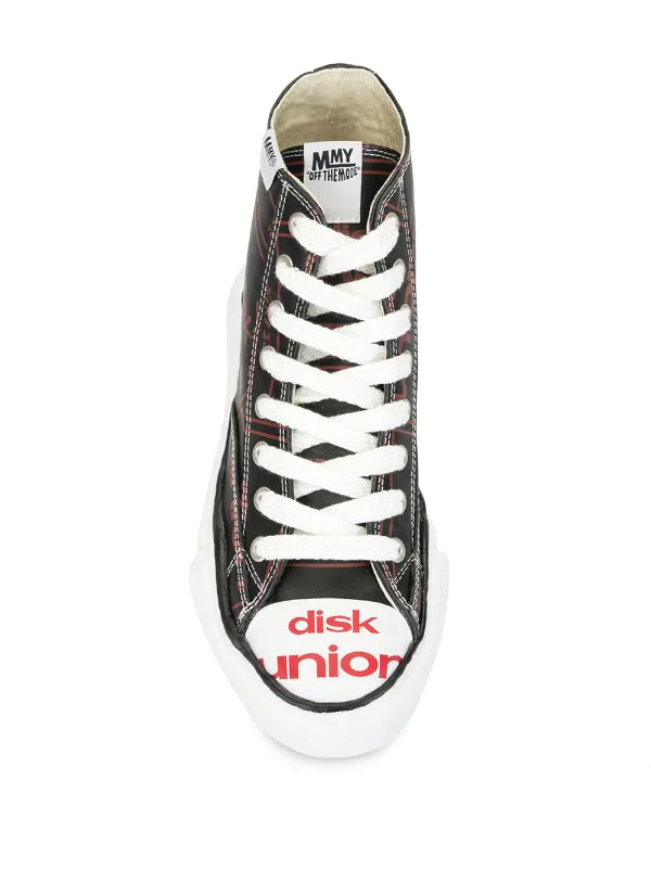 Black, red and white leather logo print high-top sneakers from Maison MIHARA YASUHIRO featuring an almond toe, a contrasting toe cap, a lace fastening, a logo patch at the tongue, front and side logo branding and a white rubber sole.