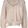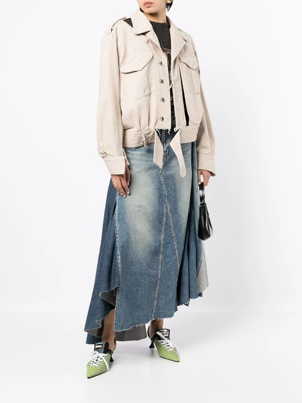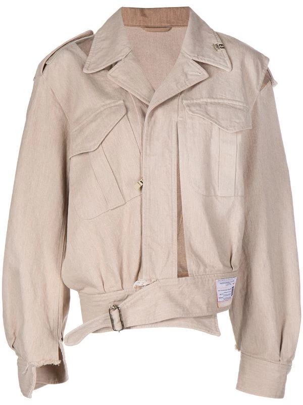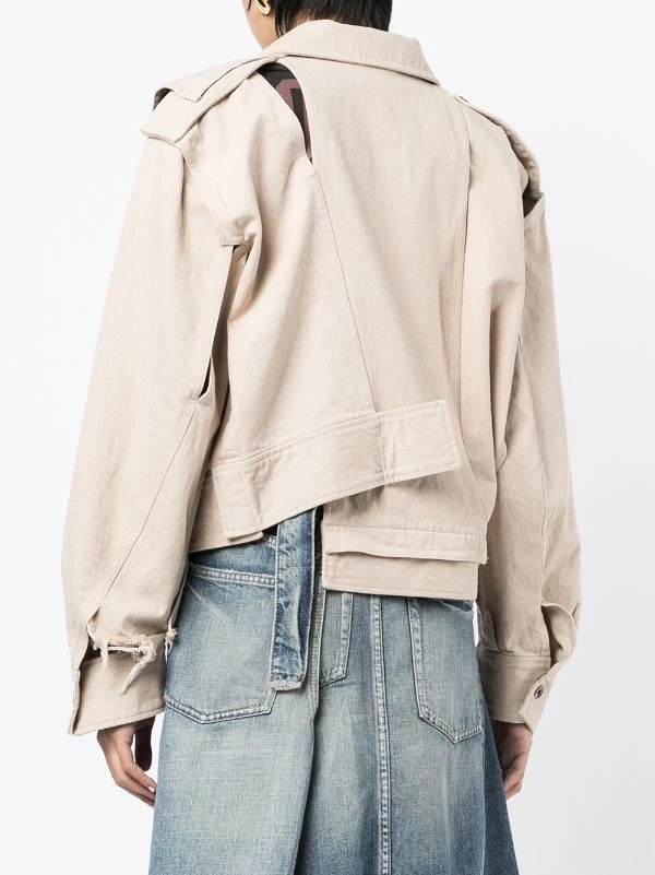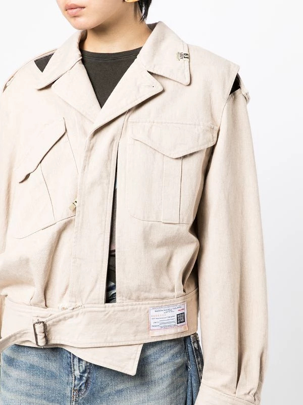 Beige cotton asymmetric biker jacket from MAISON MIHARA YASUHIRO featuring logo patch to the side, two front flap pockets, concealed front zip fastening, front buckle fastening, long sleeves, buttoned cuffs and asymmetric hem.